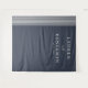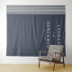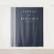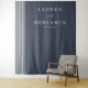 This elegant wedding backdrop features a deep navy blue background with subtle white vertical lines on the left, creating a sophisticated and minimalist design. The text is arranged in a balanced hierarchy using clean serif fonts for the names and a smaller script font for "and," ensuring readability and formality. With ample negative space, this design conveys a mood of calmness and anticipation, perfect for celebrating your special day. Its straightforward layout and restrained colour palette make it ideal for couples seeking a refined and timeless look.