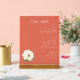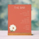 This elegant wedding menu features a minimalist design with a warm salmon pink background, creating an inviting and sophisticated atmosphere. The layout is clean and organised, with bold serif typography for the title "THE BAR" and simple sans-serif fonts listing beer, wine, and spirits options. A delicate white peony illustration adds a touch of natural beauty to the bottom left corner, enhancing the understated luxury of the design. Perfect for couples seeking a refined and modern aesthetic for their special day.