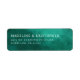 These return address labels feature a sophisticated, minimalist design with a textured teal background that gives a watercolor-like effect. The layout is clean and balanced, showcasing customizable text in an elegant serif font for a modern yet classic look. Perfect for formal occasions, the deep teal color paired with crisp white lettering creates a sense of understated elegance, making these labels ideal for weddings or special events. The simple composition focuses on clarity and readability, ensuring your address stands out with style.