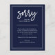 This simple and elegant navy blue announcement postcard is a way to apologise to clients or friends when you must cancel, reschedule, or postpone an event or wedding. Modern, white handwritten script adds a stylish touch, while the rectangular frame adds a formal and classic look. Use these announcement postcards for any cancellation, postponement, or rescheduling.