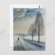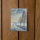 painting of a silhouette walking off in the distance in a winter landscape, birds flying in the sky, blue and white colours. customisable text