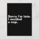Grab this "Sorry I'm late. I needed a nap." funny saying tee shirt For anyone who considers sleep a priority, not a privilege. Show your sense of humour by wearing this basic cool text style. for Black and White Contemporary Art Lovers. I'm sure that it can spark many conversations and will help with breaking the ice. This funny awkward design is a great gift idea for employees, colleagues, coworkers, managers, supervisors, friends, or family, and also makes a great birthday, holiday gift, or Christmas present. Celebrate any occasion with a touch of personality and comfort! (YOU CAN CHANGE AND CUSTOMIZE THIS TEXT DESIGN OR ANY TEXT YOU WANT IN TEXTIFY STORE!).