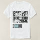 This fun and sarcastic design features the phrase "Sorry I'm Late, I Didn't Want to Come" with a melting or broken clock illustration, symbolising lateness and reluctance. The design blends bold block