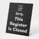 You can edit the white display text to create a custom message for your business. The black sign says: Sorry, This Register Is Closed. The top line of the display text is a script. An image is above the text. You can replace the image with your company logo.