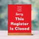 You can edit the white display text to create a custom message for your business. The bright red sign says: Sorry, This Register Is Closed. The top line of the display text is a script. An image is above the text. You can replace the image with your company logo.