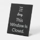 This black pedestal sign says "Sorry This Window Is Closed". The text is white and can be edited to show a different message. A display image is above the text. You can replace the image with your business logo.