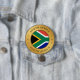 The South African flag is inset into a rounded faux gold ring. The words "South Africa" feature at the top and bottom of the design, and are of a pressed effect. The pair of three decorative stars across from each other, are also designed with a pressed effect.