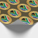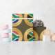 The South African flag is inset into a rounded faux gold ring. The words "South Africa" feature at the top and bottom of the design, and are of a pressed effect. The pair of three decorative stars across from each other, are also designed with a pressed effect.