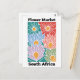 Celebrate the natural wonders of the Cape with this vibrant South Africa Flower Market design. This modern illustration features a bold, graphic arrangement of stylized blooms inspired by native flora, including layers of petals in striking shades of coral, lavender, sky blue, and deep teal.