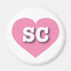 This magnet features a vibrant pink heart containing the bold, white, upper case letters SC, the official abbreviation for South Carolina, the Palmetto state.