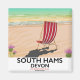 South Hams, Devon, England beach travel poster. A devon postcard rail poster of a striped deck chair on a sandy devon beach.