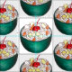 Fabric features an original illustration of a bowl of sweet, Southern-style ambrosia fruit salad, with bananas, grapes, pineapple, coconut and mandarin oranges, topped with a maraschino cherry.