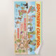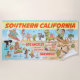 Bright and charming beach blanket offers a whimsical view of Southern California - wild characters enjoy the warm California sun showcasing Los Angeles, San Diego, Riverside, Palm Springs, Anaheim and Long Beach, Anza Borrego and Joshua Tree parks as well as the border cities of Tijuana, Tecate and Mexicali.