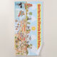 A spectacular cartoon of Southern California – showcasing Los Angeles, Anaheim, Long Beach, San Diego and many other cities plus most beaches. This bright and charming scene has it all – a surfer hangs ten while a mermaid lounges on a rock, a killer whale leaps out of the water, a muscular beach couple both flex to impress, zoo animals wait for tourists and a bull smashes into a bull fighter, all beneath the bright California sun shining high above it all.