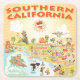 A spectacular cartoon of Southern California – showcasing Los Angeles, Anaheim, Long Beach, San Diego and many other cities plus most beaches. This bright and charming scene has it all – a surfer hangs ten while a mermaid lounges on a rock, a killer whale leaps out of the water, a muscular beach couple both flex to impress, zoo animals wait for tourists and a bull smashes into a bull fighter, all beneath the warm California sun shining bright above it all.
