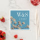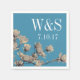Southern magnolias wedding paper napkins with a medium blue background featuring the couple's initials and wedding date in white.