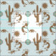 Fun Southwest pattern with Kokopelli playing flute, cactus, lizards and armadillo under a stylised sun. Aqua Blue background. Design is part of the Southwest Pastels collection. Main previews do not reflect actual colour (colour looks faded in them). For more accurate view of this design colour click on the end option, the tile preview.
