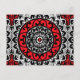 Southwestern / Aztec inspired batik textile design postcard in a sun dial / mandala pattern - rich tomato red, black and white, accented with silver grey / grey