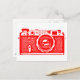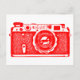 A postcard with a high contrast image of a vintage Soviet Russian range finder camera from the 1950s/60s.