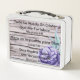 Bella lonchera de comida con diseño de flor purpura y textos bíblicos de Filipenses 4:13 “Todo lo puedo en Cristo que me fortalece”, Filipenses 4:19 “Dios suplira todo lo que hos falta…”, y otros versos bíblicos. Otro verso escrito en esta Lonchera es “Soy Tierra Fértil Para Buena Semilla y Jesucristo me da la Victoria.”