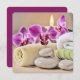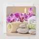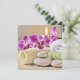 Bright pink orchids with towels, hot stones and a candle for spa bridal shower.