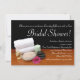 Spa Bridal Shower Invitations, perfect for a mani pedi party or ladies' night out. Elegant spa, massage therapy or salon setup. Still life scene includes items that would be used for a spa treatment including mineral bath salts soak, scented or natural body oil, hot stones for heated massage, clean white towels and a pretty pink flower, on a wood table with black background. Enjoy a bridal shower girl's day of relaxation and luxury of soothing spa, pedicure and facial services.