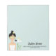 This notepad designed for spas and beauty salons etc. features Destei's cartoon illustration of a beautiful spa woman. The woman has black hair that is on a bun and there is a tropical white frangipani flower next to the bun. The woman is wearing a white towel over her body and she has cucumber slices on her eyes. Behind the woman there is a white shelf that has massage stones on it together with two white candles. Under the shelf there are two green bamboo plants bringing even more spa look to the design. The background colour is light blue. Next to the image there are personalizable text areas for the spa business name and for other information such as address and phone number.