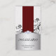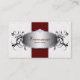 Promote your spa and salon with this deep red, silver, black and white elegant and classy floral swirl with a silver plaque and diamonds business card. This business card features a delicate leafy background with a beautiful and classy silver metal plaque with border. The plaque is adorned with diamonds on the top and sides with decorative floral and swirl accents stemming from the sides. Finally, there is a thick coloured swatch behind the decorative plaque. This elegant and classy business card is also a great match for nail technicians, fashion designers, the music industry, handbag designers, the entertainment industry, dancers, singers, actresses, makeup artists, cosmetologists, models, agencies, clothing stores, restaurants, dance studios, and more. ©2011 Pam's Designs.