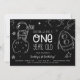 Invite friends and family to your child's birthday party with this adorable black and white outer space birthday invitation.