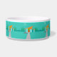 This Space Age Cartoon House Ceramic Dog Bowl is a retro lover’s dream come true. The minimalist art design features an aqua stone house with large, peacock blue windows. Hanging from the atomic, slanting, orange roof, a yellow sputnik light fixture illuminates the front door. The recessed red front door with starburst doorknob is beautifully offset by the vertical green wood planks of the exterior entryway. A grey stone path cuts across the pristine lawn, which appears turquoise in the moonlight. Behind the house, a row of a tall, thin, trees point to the turquoise sky and the white silhouette of a full moon. While no people are visible, on a night like this, the kitschy house’s inhabitants are probably inside watching news footage of the astronauts.