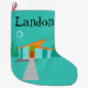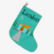 This personalised Space Age Cartoon House Christmas Stocking is a retro lover’s dream come true. The minimalist art design features an aqua stone house with large, peacock blue windows. Hanging from the atomic, slanting, orange roof, a yellow sputnik light fixture illuminates the front door. The recessed red front door with starburst doorknob is beautifully offset by the vertical green wood planks of the exterior entryway. A grey stone path cuts across the pristine lawn, which appears turquoise in the moonlight. Behind the house, a row of a tall, thin, trees point to the turquoise sky and the white silhouette of a full moon. While no people are visible, on a night like this, the kitschy house’s inhabitants are probably inside watching news footage of the astronauts. Customise with a name for a one of a kind holiday decoration.