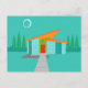 This Space Age Cartoon House Postcard is a retro lover’s dream come true. The minimalist art design features an aqua stone house with large, peacock blue windows. Hanging from the atomic, slanting, orange roof, a yellow sputnik light fixture illuminates the front door. The recessed red front door with starburst doorknob is beautifully offset by the vertical green wood planks of the exterior entryway. A grey stone path cuts across the pristine lawn, which appears turquoise in the moonlight. Behind the house, a row of a tall, thin, trees point to the turquoise sky and the white silhouette of a full moon. While no people are visible, on a night like this, the kitschy house’s inhabitants are probably inside watching news footage of the astronauts.