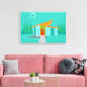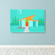 This Space Age Cartoon House Stretched Canvas Print is a retro lover’s dream come true. The minimalist art design features an aqua stone house with large, peacock blue windows. Hanging from the atomic, slanting, orange roof, a yellow sputnik light fixture illuminates the front door. The recessed red front door with starburst doorknob is beautifully offset by the vertical green wood planks of the exterior entryway. A grey stone path cuts across the pristine lawn, which appears turquoise in the moonlight. Behind the house, a row of a tall, thin, trees point to the turquoise sky and the white silhouette of a full moon. While no people are visible, on a night like this, the kitschy house’s inhabitants are probably inside watching news footage of the astronauts.