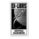 An Ex Libris design with a woodcut/ linocut style motif depicting a rocket orbiting a planet. Inspired by Soviet space exploration imagery from the 50s and 60s