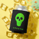 Space alien face neon green black UFO beer can cooler. Personalise We Are Not Alone text. Image copyright Marg Seregelyi Photography.