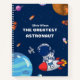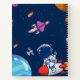 This custom notebook features a cute space themed pattern with planets and Space Astronaut , rocket ships, and abstract shapes on a dark navy blue background. Personalise it with your name. Great gift idea for kids