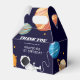 Outer space themed birthday favour boxes featuring a starry sky background, planets of the solar system, a rocket ship, astronaut, and a birthday thank you template that is easy to personalise.