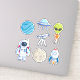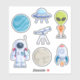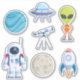 Sticker set with a planet, the moon, an astronaut, a rocket ship, an alien, a telescope and a flying saucer.