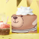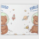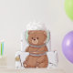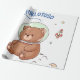 An adorable teddy bear astronaut sits happily on a tiny planet, dreaming among stars and rockets.
