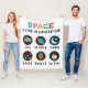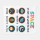 Playful space themed artwork made for curious kids and young students. Cute symbols like UFO, planet, moon, stars, rocket and alien help children explore space science and basic astronomy in a fun and friendly way.