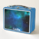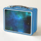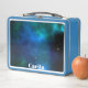 A custom metal lunch box with a blue space background on both sides. You can add your name to this item by using the custom template.