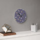 Cute and funny wall clock with celestial space design with colourful moons, rockets, planets and stars on a blue purple background. Perfect for a boys room, nursery or a playroom.