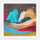A vibrant, textured digital illustration featuring rounded fantasy mountains set against a dark sky full of golden stars. The style is modern and abstract, with a heavy emphasis on color contrast and layered textures.