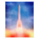 A Silver Space Rocket Blasts off and upward into the blue skies above as its orange, red and hot white fumes and gases explode downward propelling this missile from its launch pad. Spray paint art by artist Jason Girard.