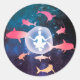 Silhouette of a yogist in a lotus position, inside a bubble, meditating while sharks are circling around.