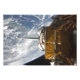 Space Shuttle Atlantis' payload bay backdropped by a blue and white Earth featured with STS-125.