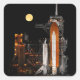 The space shuttle Discovery sits on the launch pad 39A at Kennedy Space Centre in Cape Canaveral Florida. A nearly full moon glows in the sky to add a dramatic background.