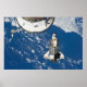 Space shuttle Discovery is featured in this image photographed by an Expedition 23 crew member on the International Space Station soon after the shuttle and station began their post-undocking relative separation. Undocking of the two spacecraft occurred at 7:52 a.m. (CDT) on April 17, 2010, ending a stay of 10 days, 5 hours and 8 minutes. The visit included three spacewalks and delivery of more than seven tons of equipment and supplies. A blue and white part of Earth provides the backdrop for the scene. A small portion of a Russian spacecraft, docked with the station, is visible at top.