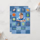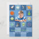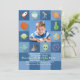 A perfect invitation for your outer space enthusiast's birthday. The chequerboard blue on blue pattern features space-related icons and a centre photo window.