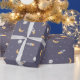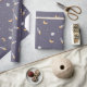 Space wrapping paper with celestial pattern featuring spaceships, planets, moons and stars on dark blue sky.